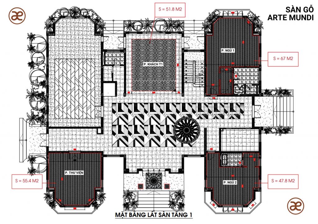 - Không gian sử dụng sàn gỗ: 6 Phòng khách, 2 phòng ngủ, 1 thư viện, hành lang