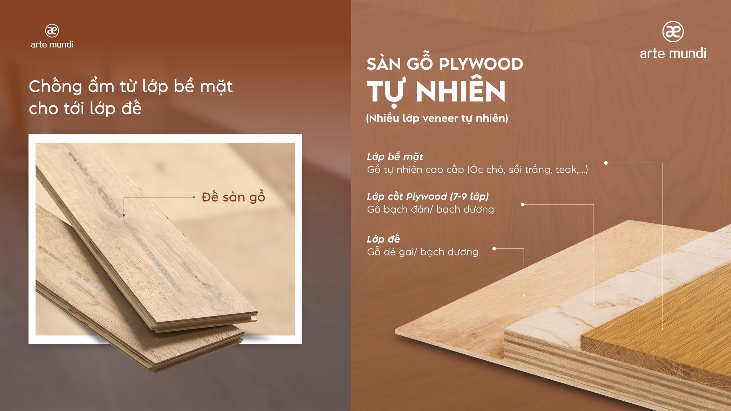 Cấu tạo nhiều lớp của sàn engineer (sàn gỗ kỹ thuật hay sàn gỗ plywood) của Arte Mundi